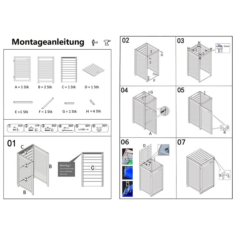 - Die Stahlschiene am Boden hat 3 x Löcher und man kann es mit dem Untergrund verschrauben. Das verleiht der Mülltonnenbox zusätzliche Stabilität. Es gibt unterschiedliche Untergründe und wir können leider nicht für jeden Untergrund die passenden Befestigungsmaterialien liefern. Befestigungsmaterial dafür ist nicht im Lieferumfang enthalten.